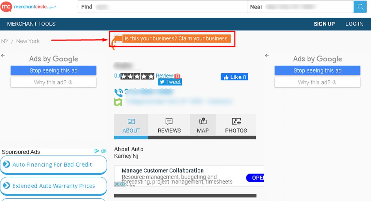 Step 1. Search for your business on MerchantCircle and open your existing listing. Next, click “Is this your business? Claim your business”.