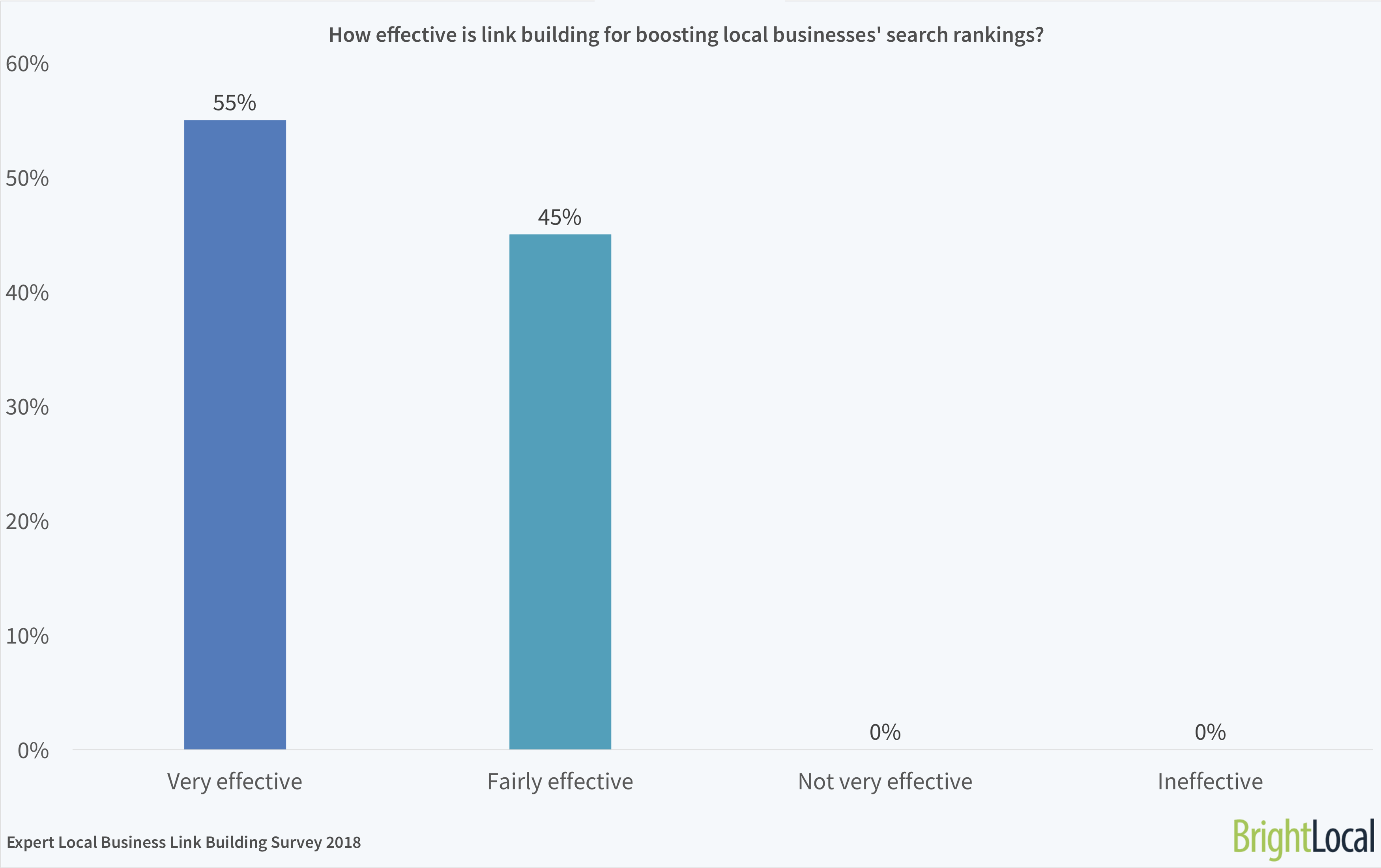 Link building is indisputably effective for local businesses looking to rank highly in SERPs. Every member of the panel told us that link building is effective for local businesses – with 55% of these saying it’s very effective.