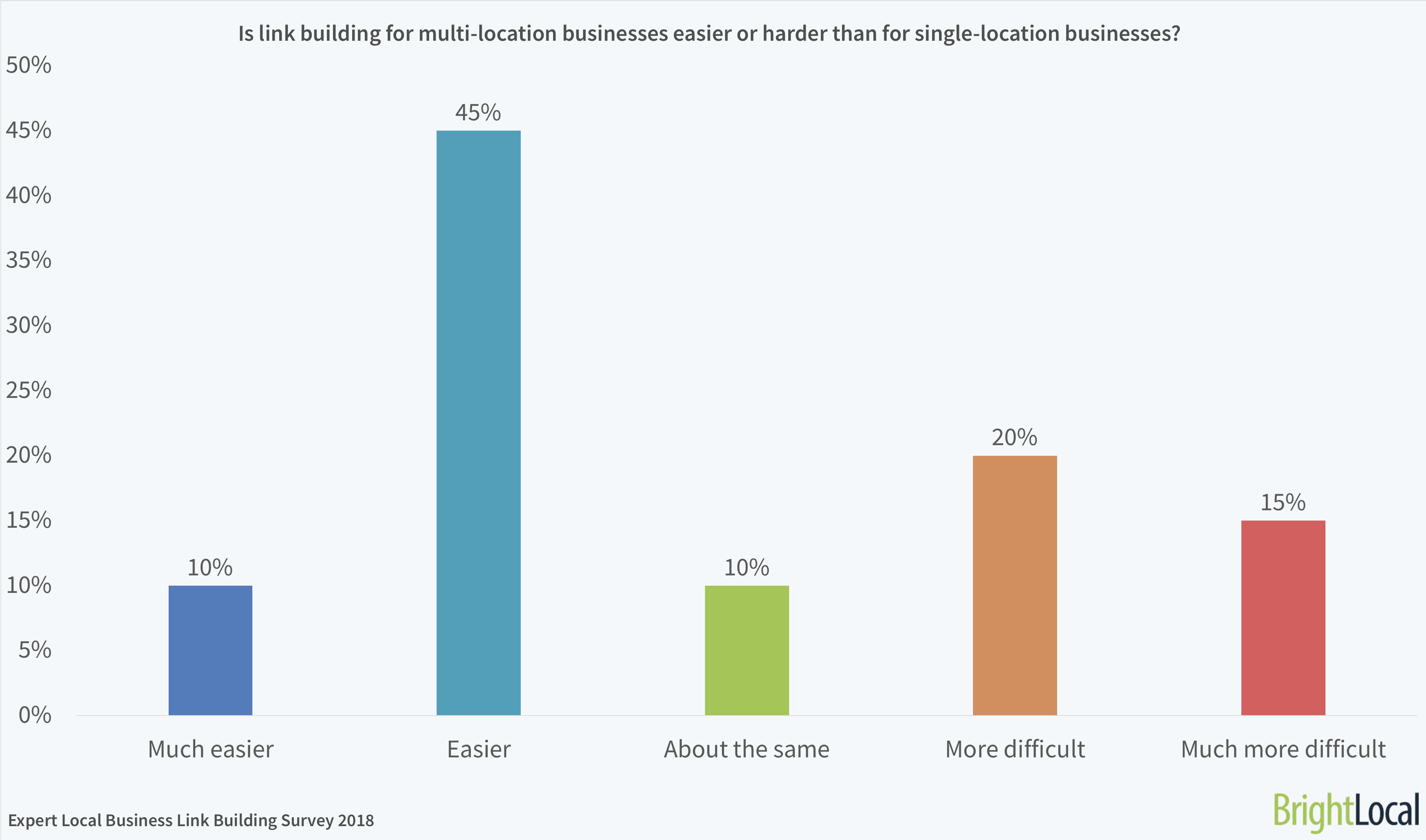 There’s no definitive answer among our experts on what’s more difficult: link building for single locations or link building for multiple locations. 55% think it’s easier for multi-location, while 35% say it’s more difficult.