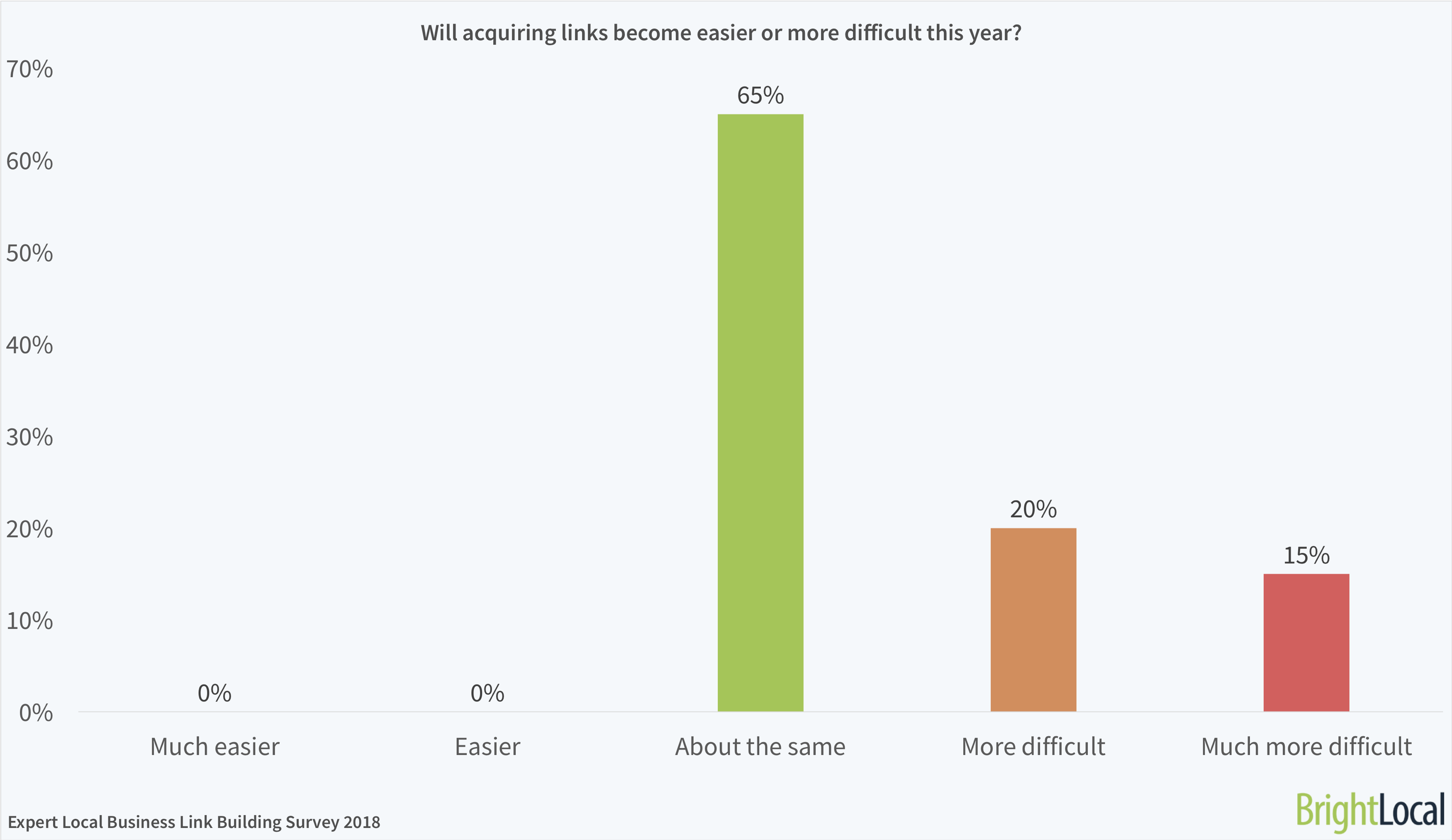 There’s not much hope among the experts on the ease of acquiring links – with 35% predicting link building will be harder this year. While the majority think it’ll be about the same level of difficulty, not one of the experts think it will become easier to get links in 2018.