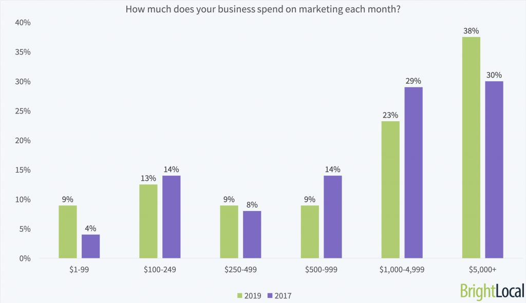 The local businesses, franchises, and brands in our study are now more likely to spend more than $5,000 a month on marketing. At the other end of the scale, slightly more businesses are spending less than $100.