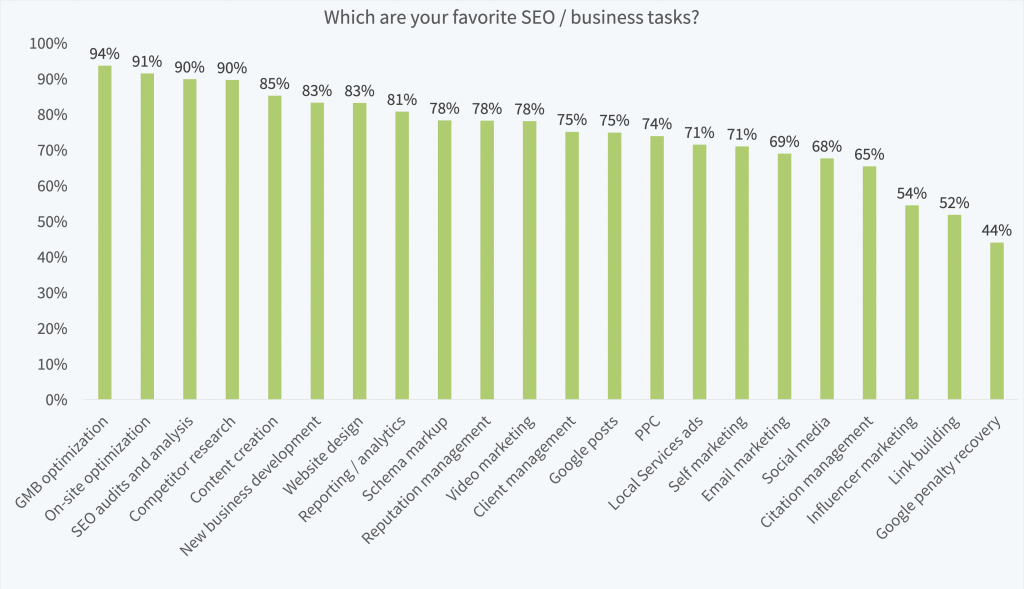 SEOs' favorite tasks are heavily data-driven (on-site optimization, SEO audit and analysis, and GMB optimization)