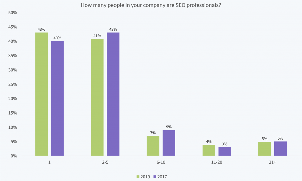 Interestingly, nearly half of respondents have just one SEO professional in their organization.