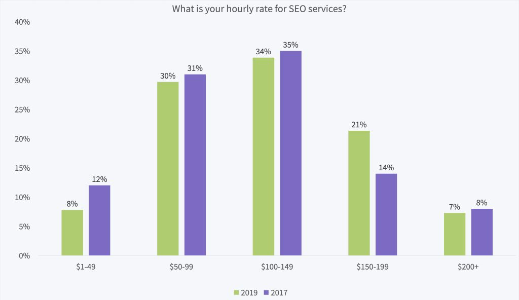 $100-149 is the most popular hourly rate for SEOs, with 34% charging this amount. More marketers are now charging between $150 and $199.