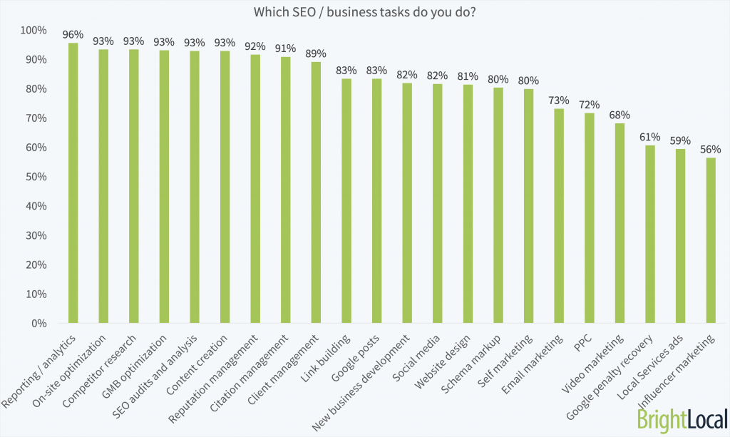 Respondents were asked to share which local SEO and business-related tasks they perform. While the top ten consists of key search marketing skills, just outside are some newer skills.