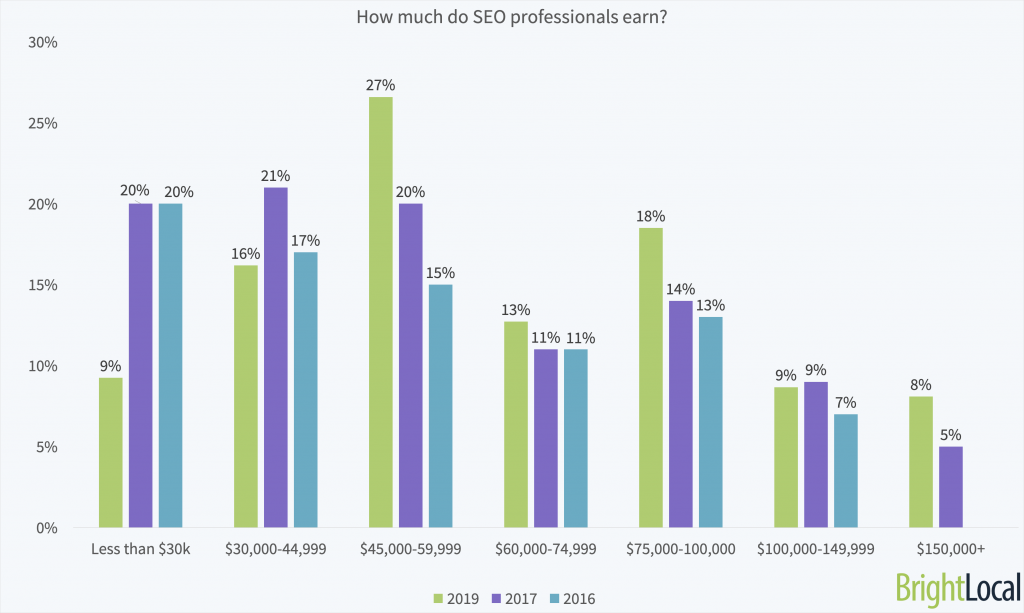 Over the last few years of the Local Search Industry Survey, we’ve seen continued year-on-year growth in search marketers’ salaries. Now, just 9% earn less than $30,000 – down from 20% of respondents in 2016 and 2017. The biggest growth is in the $45,000-59,999 salary bracket.