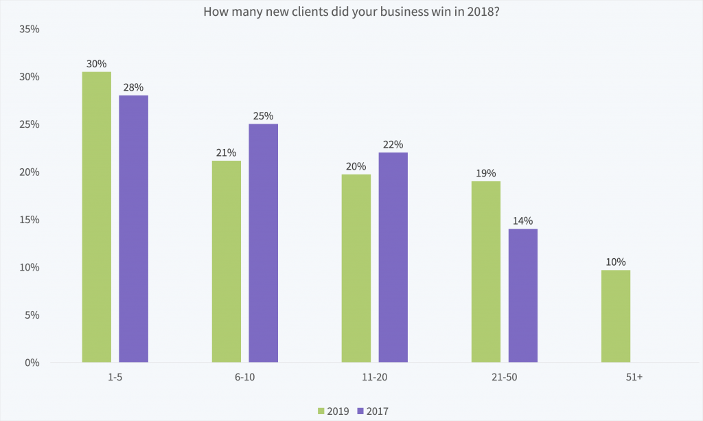 As you’d expect from increased lead conversion rates, new client numbers grew this year. Last year, 14% won over 21 new clients. This year, 29% of respondents’ businesses did.